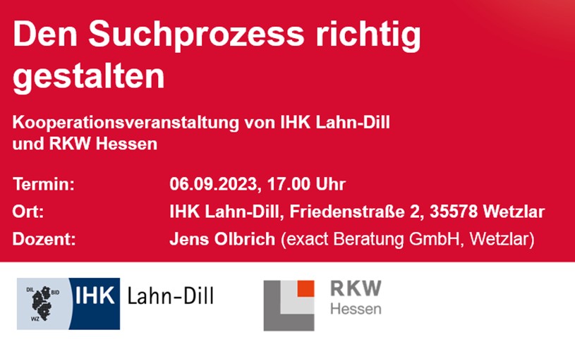 Der Vortrag ist eine Kooperationsveranstaltung von IHK Lahn-Dill und RKW Hessen am 06.09.2023 um 17.00 Uhr in der IHK Lahn-Dill, Friedenstraße 2, 35578 Wetzlar.